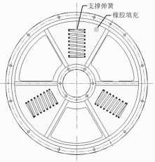 由于該機車已經(jīng)生產(chǎn)20列,如對整體結(jié)構(gòu)做大的改動,費用將非常昂貴,這是用戶和制造商都無法接受的。因此需在原部件做適當(dāng)改動,要能充分利用原部件,避免原部件報廢或者改造費用過高,要達到既不產(chǎn)生較大費用,同時也能顯著提高主發(fā)電機固有頻率的目的。通過分析主發(fā)電機結(jié)構(gòu),尋找強度和穩(wěn)定性的薄弱點,最終選擇對主發(fā)電機端蓋做升級,將原普通結(jié)構(gòu)端蓋改為內(nèi)部帶彈簧和橡膠阻尼的新型端蓋。改動升級的目的:(1)通過在端蓋上增加彈簧和橡膠阻尼,從而提高端蓋的內(nèi)應(yīng)力,提高端蓋的強度和穩(wěn)定性,提高主發(fā)電機固有頻率:(2)利用彈簧和橡膠阻尼吸收部分振動,通過將振動轉(zhuǎn)化為其他能量,從而降低主發(fā)電機的振動值。彈簧阻尼端蓋的等效結(jié)構(gòu)圖如圖2所示。