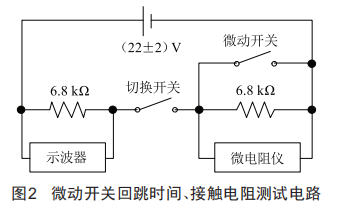 微動開關(guān)觸點(diǎn)從首次閉合到穩(wěn)定接觸全過程的耗時(shí)為觸點(diǎn)回跳時(shí)間,常采用特殊的觸發(fā)電路和示波器測試。本文將典型的觸點(diǎn)回跳測試電路進(jìn)行了如圖2所示的改進(jìn),以同時(shí)測試微動開關(guān)觸點(diǎn)接觸電阻。系統(tǒng)測試啟動后,控制系統(tǒng)將微電阻測試儀從測試電路斷開并閉合切換開關(guān),控制程控電源輸出20V電壓,并將示波器設(shè)置為上升沿觸發(fā)。當(dāng)微動開關(guān)速動機(jī)構(gòu)發(fā)生正向動作時(shí),示波器被觸發(fā),控制軟件讀取示波器波形并計(jì)算回跳時(shí)間。當(dāng)微動開關(guān)到達(dá)全行程位置時(shí),控制系統(tǒng)關(guān)閉程控電源輸出,斷開切換開關(guān),并將微電阻測試儀連接至測試電路,從而測得微動開關(guān)常開觸點(diǎn)的接觸電阻。