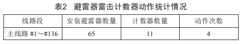 由于裝設(shè)的固定外串聯(lián)間隙避雷器數(shù)量較多,我們選取了主線路#1~#136桿作為研究對象,統(tǒng)計避雷器雷電計數(shù)器的動作情況,如表2所示。
