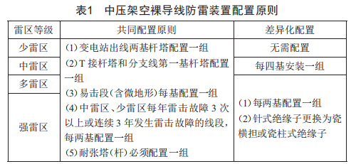中壓架空絕緣導線防雷裝置應選用固定外串聯(lián)間隙避雷器(帶穿刺線夾),強雷區(qū)、多雷區(qū)和中雷區(qū)應每基安裝一組,少雷區(qū)無需安裝。臺架變壓器及柱上開關(guān)防雷裝置應選用無間隙金屬氧化物避雷器。臺架變高低壓側(cè)均需配置無間隙避雷器,前后各一基桿塔配置固定外串聯(lián)間隙避雷器,柱上開關(guān)兩側(cè)均需配置無間隙避雷器,前后各一基桿塔配置固定外串聯(lián)間隙避雷器。配變臺架高、低壓側(cè)均須安裝無間隙避雷器,且高壓避雷器接地端、低壓避雷器接地端、配電變壓器低壓繞組中性點和外殼,須采取四點聯(lián)合接地方式。配置原則如表1所示。