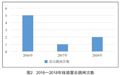 防雷改造于2017年4月完成,而雷擊一般發(fā)生在5月一10月份夏秋季,通過比較2016一2018年線路雷擊跳閘情況,能夠較清晰地檢驗防雷改造的效果。2016一2018年線路雷擊跳閘情況如圖2所示。