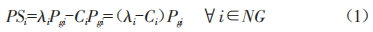 式中,A為節(jié)點邊界電價,Ai為第i個發(fā)電單元售電電價:NG表示系統(tǒng)發(fā)電電源總數(shù):Ci為第i個發(fā)電單元投資單價:Pgi為第i個發(fā)電單元發(fā)電量。