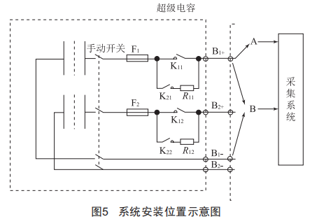 以某型儲(chǔ)能式現(xiàn)代有軌電車為例,測(cè)試時(shí)在車載超級(jí)電容進(jìn)線端A安裝電流傳感器,正負(fù)極兩端B安裝電壓傳感器,使用該數(shù)據(jù)采集系統(tǒng)進(jìn)行數(shù)據(jù)采集和存儲(chǔ),安裝位置如圖5所示。