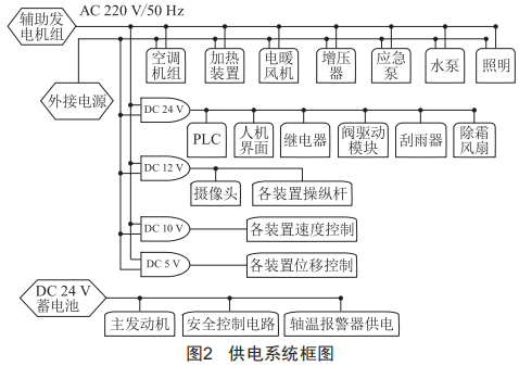 用于主發(fā)柴油機啟動時給柴油機控制器提供電源,同時為整車的安全聯(lián)鎖控制電路和無火回送軸溫報警系統(tǒng)提供電源。2.2AC220V/50Hz供電系統(tǒng)