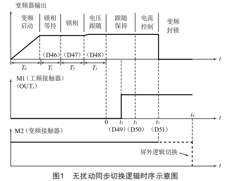 此外,同步切換必須遵從正確的切換邏輯,以確保切換無誤。其主要過程包括變頻器啟動輸出、鎖相等待過程、鎖相、電壓跟隨、控制模式轉換及同步接觸器切換邏輯輸出等環(huán)節(jié),切換邏輯時序如圖1所示。