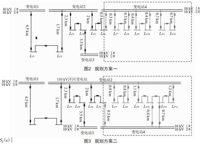 以某地區(qū)10kV配電網為例,基于全壽命周期的SEC量化評估模型對該配電網參與比選的方案一及方案二(圖2、圖3,虛線框內為新建網架)進行評估,不同方案中相應供電線路的長度如圖中所示,不計聯絡線長度。