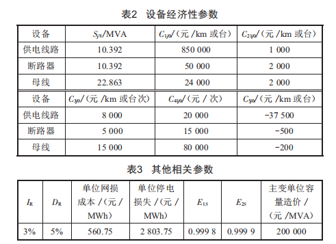 在SEC評估中,主要計及供電線路、開閉所進線斷路器(包括聯絡線斷路器)及開閉所母線等三類設備,三類設備的平均使用壽命均為15年。設備的可靠性參數如表1所示。設備規(guī)劃起始年的經濟性參數如表2所示,其他相關參數如表9所示。其中,C1a0、C21a0、C9a0、C41a0及C5a0為規(guī)劃(評估)初始年的相應成本。