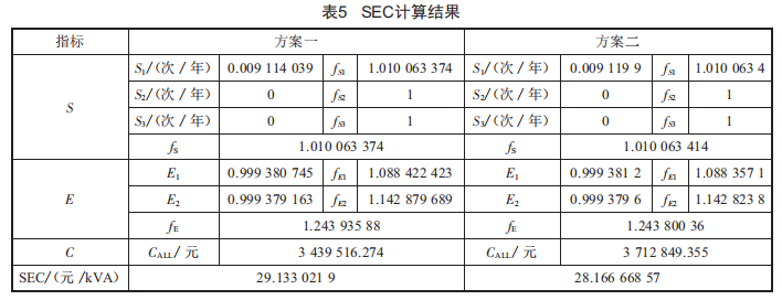 取規(guī)劃評估年限Nw為設備的平均使用壽命15年,則配電網兩個規(guī)劃方案的SEC相關計算結果如表5所示。表5中,CALL為評估中所有相關設備總的全壽命周期成本(等年值)。