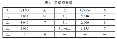 配電網負荷點LP1~LP12的功率因數均為0.85,各負荷點的用戶數及負荷大小保持不變,如表4所示。由表4可知,LP4的供電線路為備用線路,正常運行時不帶負荷,且電網正常運行時聯絡線斷路器不投入,相應設備的E4j按10%計算。除LP4外,其余負荷點為電壓合格率的檢測節(jié)點。