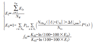 式中,ⅣVW和ⅣVBxW分別為評估期第W年電壓合格率的檢測節(jié)點數和系統(tǒng)狀態(tài)x下出現電壓越限的節(jié)點數:UⅣi為節(jié)點i的額定電壓:AUim一a為節(jié)點i的最大允許電壓偏差:fE2為E2指標因子:KE2為E2的調整系數,通常取KE2=10[1]:E2s為E2的考核值。