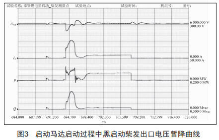9E級燃機的輔機設(shè)備按照專業(yè)類型可以分為化學、汽機、鍋爐和燃機4個方面?;瘜W側(cè)負載約為85kw,汽機側(cè)約為105kw,鍋爐側(cè)約為1155kw,燃機側(cè)約為1355kw,其中燃機啟動馬達的額定功率為1000kw。在啟動輔機設(shè)備時,黑啟動柴發(fā)出口電壓會出現(xiàn)暫時下降,隨后電壓恢復并趨于平穩(wěn),而啟動馬達功率較大,可在啟動馬達開啟前將黑啟動出口電壓暫時升高,以避免啟動馬達啟動后電壓降幅過大,引發(fā)廠用電裝置低電壓保護動作。啟動馬達啟動過程中黑啟動柴發(fā)出口電壓暫降曲線如圖3所示。
