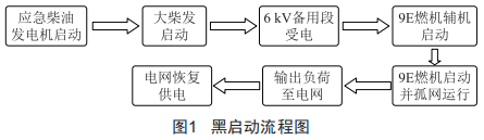 奉賢燃機黑啟動柴發(fā)機組分為柴油機和發(fā)電機兩部分,柴油機為德國MAN公司18V32/28S型中速柴油機,發(fā)電機為美國AVK公司的ZFNLo22-225型發(fā)電機。該柴發(fā)機組具有啟動迅速、負荷適應(yīng)能力強、設(shè)備一鍵啟停等特點。奉賢燃機自備兩個2000m3的儲油罐,黑啟動柴發(fā)可通過油罐靜壓方式獲取燃油。在電網(wǎng)全黑后,小柴發(fā)(應(yīng)急柴油發(fā)電機)可在數(shù)秒內(nèi)啟動,帶動大柴發(fā)的400V負荷,再啟動大柴發(fā)輸出至6kV備用段,使6kV廠用電系統(tǒng)受電,并帶9E燃機輔機啟動,隨后可啟動任意一臺9E燃機,最后通過架空線路送出負荷,恢復電網(wǎng)供電。整體啟動過程如圖1所示。