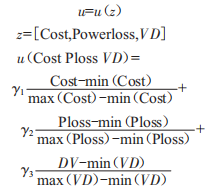 對于多目標優(yōu)化問題,通常很難滿足不同決策者的要求,通常解決的方法是在不同目標之間進行協(xié)調和折衷,運用權重系數(shù)的多目標優(yōu)化方法是解決此類問題最直接有效的途徑。本文中包含3個計劃目標:總投資CoSt、線路損耗PowerloSS和電壓偏差VD,價值函數(shù)如下所示: