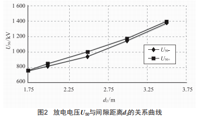 作業(yè)人員處于模擬管型母線上對(duì)相鄰母線的放電電壓如圖2所示,間隙距離在1.75~3.75m,正極性U50+和負(fù)極性U50-放電的差異性在間隙距離2.5m時(shí)最大,為6%,其他間隙距離下兩者放電的差異性均小于4%。而根據(jù)試驗(yàn)數(shù)據(jù)計(jì)算得出負(fù)極性下的間隙系數(shù)Kg為1.07~1.29,正極性的間隙系數(shù)Kg為1.08~1.31,在正負(fù)極性試驗(yàn)中間隙系數(shù)均隨著間隙的增大而增大,而110kV變電站的相間間隙距離在1.9m左右,考慮安全裕度,取間隙系數(shù)Kg為1.07。