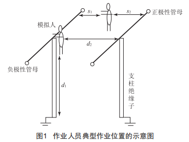 試驗(yàn)管母間帶電作業(yè)的相間最小安全距離時(shí),分為作業(yè)人員在負(fù)極性管母處和在正極性管母處進(jìn)行等電位作業(yè)兩部分進(jìn)行。試驗(yàn)中將模擬人放置在負(fù)極性或正極性管母處,并用銅導(dǎo)線將模擬人和管母連接,使二者保持等電位,試驗(yàn)中兩管母的距離d2可以調(diào)整。具體試品布置示意圖如圖1所示。