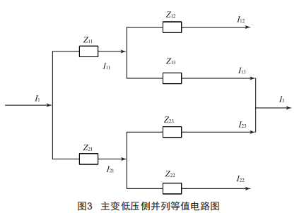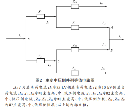 當(dāng)兩臺變壓器高、低壓側(cè)(或高、中壓側(cè))并列運(yùn)行,而中壓(或低壓)側(cè)負(fù)荷全部由其中一臺主變帶時(shí)(分開運(yùn)行),兩臺變壓器的負(fù)荷分配將出現(xiàn)不對稱現(xiàn)象,并且結(jié)合中低壓側(cè)出線負(fù)荷比例的變化,這一不對稱程度會進(jìn)一步加大,從而使變電站在某種運(yùn)行方式下產(chǎn)生環(huán)流問題。