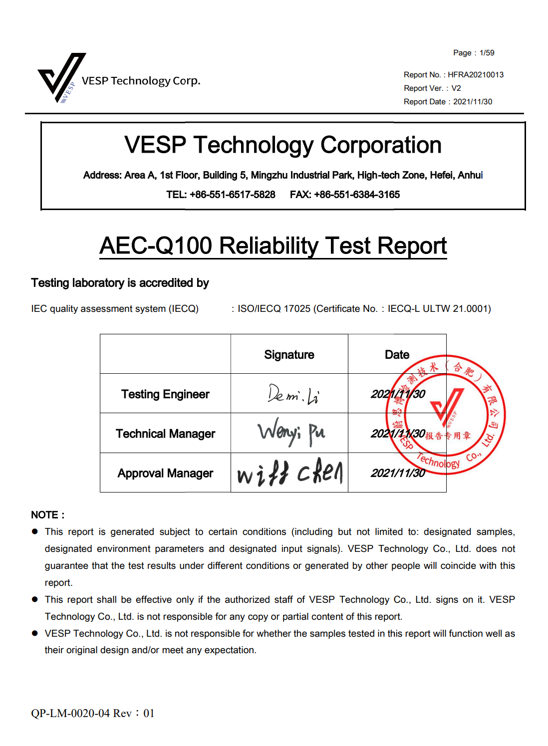 伏達(dá)NU8015Q/NU8040Q集成功率級芯片的車規(guī)級器件可靠性測試報告,由合肥蔚思博檢測技術(shù)有限公司頒發(fā)。