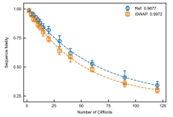 達(dá)摩院量子實(shí)驗(yàn)室還在fluxonium上驗(yàn)證了自研的超導(dǎo)量子芯片整體計(jì)算性能的優(yōu)化方案,包括針對(duì)超導(dǎo)架構(gòu)的單比特門通用優(yōu)化編譯方案,針對(duì)超導(dǎo)芯片上的另一種原生操控SQiSW門的即時(shí)最優(yōu)編譯方案等。該優(yōu)化方案可以大幅提升量子芯片的整體性能指標(biāo)。