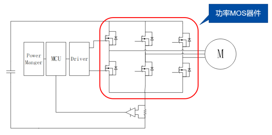 輕型電動車通常使用鋰電池供電,需要控制器對直流母線進行斬波換相,將直流電轉換成交流電后才能驅動無刷電機。鋰電池輸出電壓為48/60/72V,輕型電動車用電機功率集中在400~3000W,相應地可以選用70/85/100V電壓檔,80A~360A電流能力的SGT器件。與典型的工業(yè)三相交流電機系統(tǒng)一樣,輕型電動車控制器的核心電路為功率MOS器件組成的三相全橋逆變電路。逆變電路受控制器PWM控制,實現直流到交流的電能變換,其工頻通常為16~30kHz。