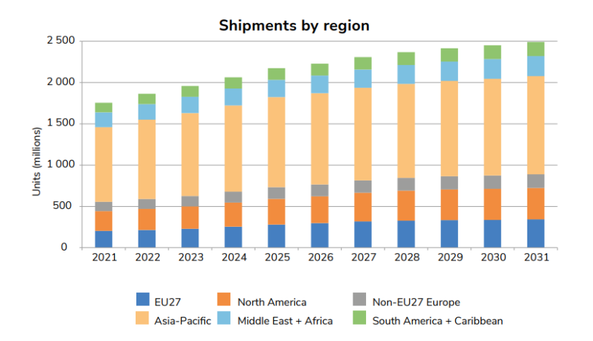 根據(jù)《報(bào)告》,預(yù)計(jì)從2021年到2031的十年間,全球GNSS接收機(jī)的年出貨量將持續(xù)增長(zhǎng),從2021年的18億臺(tái)套增長(zhǎng)至2031年的25億臺(tái)套,其中亞太地區(qū)仍將是最大市場(chǎng)。