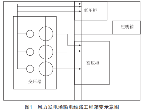 箱變安裝是風力發(fā)電場輸電線路工程施工中的重要環(huán)節(jié),在設(shè)備運到現(xiàn)場后,技術(shù)人員要結(jié)合箱變示意圖(圖1)核對產(chǎn)品信息,確保其容量、電壓等級等數(shù)據(jù)符合設(shè)計需求。技術(shù)人員要結(jié)合"拆卸件一覽表"進行核對,保證變壓器的主機及附件完好,要利用16t的調(diào)車進行安裝,在基礎(chǔ)施工養(yǎng)護完成后,結(jié)合中心線位置,將其吊運到基礎(chǔ)上,將其與基礎(chǔ)的預(yù)埋件進行焊接,提出兩根扁鐵,與接地設(shè)置連接。