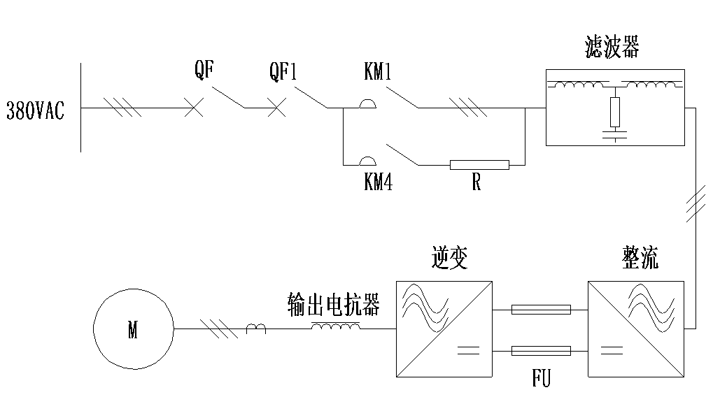 本次英威騰的方案,主回路主要由用戶開(kāi)關(guān)QF,變頻器輸入主斷路器QF1,緩沖接觸器KM4,主回路接觸器KM1,LCL濾波器,整流單元,逆變單元以及輸出電抗器幾部分組成。