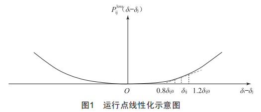 隨后,將上式代入數(shù)學(xué)模型中進(jìn)行計(jì)算,得到基于預(yù)處理模型的相角差初值θij0。由于原模型θij和預(yù)處理模型θij0的值非常接近,因此可對(duì)θEQ \* jc3 \* hps10 \o\al(\s\up 3(進(jìn)行如圖l所示的運(yùn)行點(diǎn)線性化。
