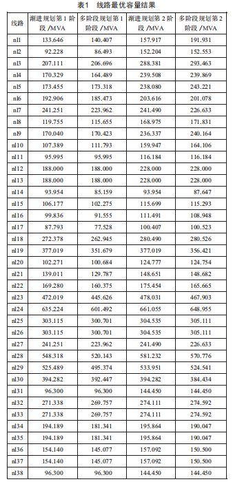 假設(shè)第二階段有功各節(jié)點(diǎn)負(fù)荷增加30MV,無功增加20%,風(fēng)電光伏出力增加50%,設(shè)置漸進(jìn)規(guī)劃權(quán)重系數(shù)值為0.7,通過GAMs調(diào)用Cp1ex求解,線路最優(yōu)容量結(jié)果如表l所示。