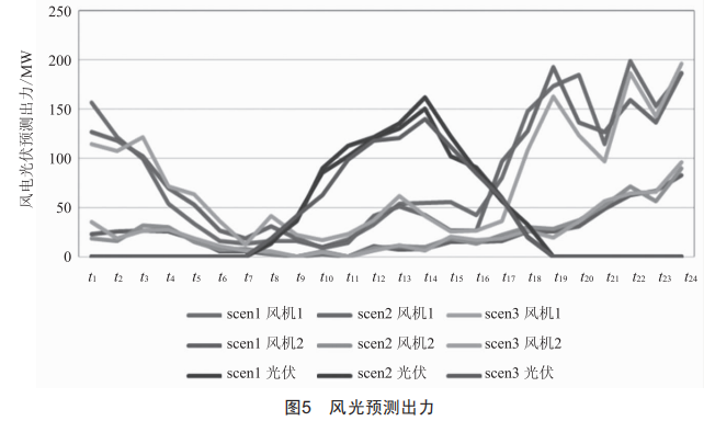 選取典型日中3個(gè)不同場景下風(fēng)光出力預(yù)測如圖5所示,其中場景scenl概率為0.46,場景scen3概率為0.16,場景scen3概率為0.38。