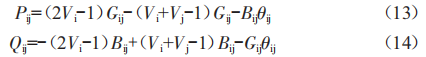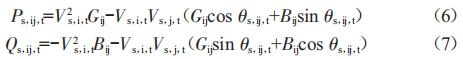 式中,Pg,ij,s、0g,ij,s分別表示從i節(jié)點(diǎn)流向j節(jié)點(diǎn)的有功功率和無功功率:vg,i,s為i節(jié)點(diǎn)上的電壓,Gij、Bij和θg,ij,s分別為支路ij的電導(dǎo)、電納和兩端的電壓相角差。