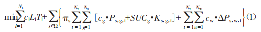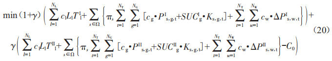 式中,0表示場景+的集合:m+表示場景+發(fā)生的概率:Nw表示線路數(shù)量:NT表示總時(shí)段數(shù):NL表示發(fā)電機(jī)數(shù)量:Nw表示風(fēng)機(jī)(光伏)數(shù)量:P+,s,g為在場景+中發(fā)電機(jī)s在1時(shí)刻的出力:AP+,t,g表示在場景+中風(fēng)機(jī)(光伏)t在1時(shí)刻的棄風(fēng)量:cl表示線路投資成本:cs表示發(fā)電機(jī)的出力成本:sUCs表示機(jī)組s的啟動(dòng)成本:ct表示風(fēng)電的棄風(fēng)(棄光)懲罰成本:K+,s,g表示0-1變量,反映機(jī)組的啟動(dòng)狀態(tài),1表示啟動(dòng),0表示未啟動(dòng)。