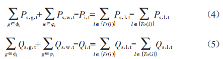 式中,節(jié)點(diǎn)視在功率平衡式包括節(jié)點(diǎn)有功平衡式和節(jié)點(diǎn)無功平衡式。6i表示與節(jié)點(diǎn)i相連的發(fā)電機(jī)集合:。i表示與節(jié)點(diǎn)i相連的風(fēng)機(jī)(光伏)集合: