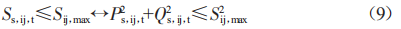 式中,視在功率平衡式中包括有功平衡和無功平衡。為方便敘述,下述表述中均為相應(yīng)量在場景+中1時(shí)刻的值。P+,s,g為風(fēng)機(jī)(光伏)t的有功出力:Pi,g為節(jié)點(diǎn)i有功負(fù)荷:0+,s,g為機(jī)組s的無功出力:0+,t,g為風(fēng)機(jī)(光伏)t的無功出力:0i,g為節(jié)點(diǎn)i的無功負(fù)荷。