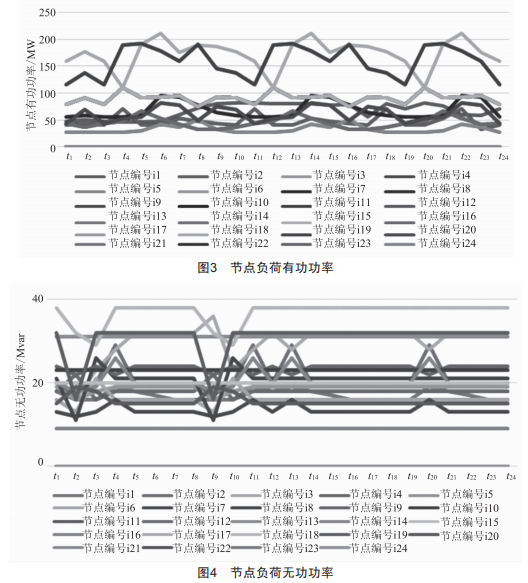 選取典型日各節(jié)點(diǎn)負(fù)荷有功、無功功率,如圖3、圖4所示。