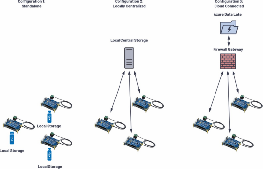 圖15最左側的配置是脫機收集數(shù)據(jù)示例,一般發(fā)生在偏遠位置或無法聯(lián)網(wǎng)的地方。在這種情況下,平臺會配備大型存儲媒介,并按照計劃來收集數(shù)據(jù)?;蛘?,其他兩個選項是將數(shù)據(jù)流傳輸至同一個端點。圖15中間的配置是隔離網(wǎng)絡,可能僅供組織內部使用,或者是偏遠位置的一組用于集中收集數(shù)據(jù)的平臺。出于安全考慮,或者在無法聯(lián)網(wǎng)時,可能需要這種配置。在這些配置下,CN0549易于設置,且能夠根據(jù)終端部署的特定需求來自定義。