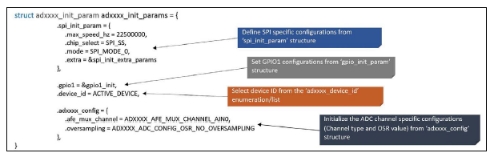 ? 第1步:在應(yīng)用程序中創(chuàng)建器件初始化結(jié)構(gòu)的定義(或?qū)嵗?(例如struct adxxxx_init_params),以初始化用戶特定的器件參數(shù)和平臺(tái)相關(guān)的驅(qū)動(dòng)程序參數(shù)。參數(shù)在編譯期間定義。