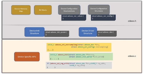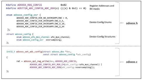 如前所述,adxxxx.h頭文件包含所有器件特定枚舉和結(jié)構(gòu)的聲明,這些枚舉和結(jié)構(gòu)被傳遞到器件特定的函數(shù)或API以配置或訪問器件參數(shù)。具體情況如圖3所示。