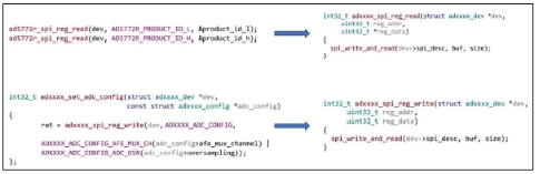 用戶可以通過no-OS驅(qū)動(dòng)程序器件特定的adxxx_read/write()函數(shù)訪問器件寄存器內(nèi)容(例如產(chǎn)品ID、暫存區(qū)值、OSR等)。