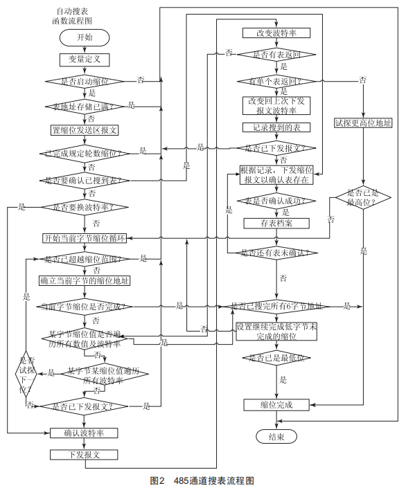 從表地址最低位開(kāi)始,從00~99開(kāi)始嘗試,以最低位為例,按不同波特率發(fā)送表地址為AAAAAAAAAA00的查詢報(bào)文,存在以下幾種情況:(1)無(wú)返回,說(shuō)明不存在以00結(jié)尾的表,此時(shí)最低位地址加1,然后重新嘗試。(2)有返回,報(bào)文合法,說(shuō)明只有一塊表的表地址符合要求,記錄該表地址,生成相關(guān)事件,同時(shí)最低位地址加1,再重新嘗試下一塊表。(3)有返回,但是報(bào)文不合法,說(shuō)明可能多表符合要求,此時(shí)固定低地址,進(jìn)行高位縮位,即以AAAAAAAAZZxx的報(bào)文嘗試,其中xx為剛才固定的地址,ZZ范圍為00~99。此時(shí)按步驟(2)繼續(xù),逐步向高位縮位。(4)高位縮位完畢,最低位地址加1,繼續(xù)下一步縮位,直到最低位縮位完畢。