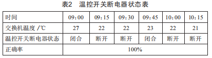 筆者將散熱系統(tǒng)模型安裝在公司11樓配線間一臺(tái)交換機(jī)上進(jìn)行實(shí)驗(yàn),并將溫度控制器的控制溫度設(shè)置為22℃,經(jīng)過(guò)1h后的觀測(cè),結(jié)果如表2所示。