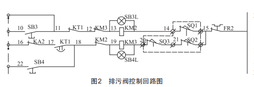 (1)關限位誤動??刂葡淝惺謩?排污閥控制回路如圖2所示,圖中10~22為接線端子編號,sB4是排污閥關按鈕,按下sB4如果電機二次回路無反應,先檢查s02(內(nèi)限位)和s03(外限位)是否發(fā)生誤動,當任何一個限位發(fā)生誤動,排污閥關閉無反應。此時應該檢查出現(xiàn)異常的限位開關,對其進行處理或更換。