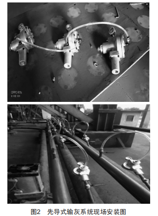 (5)本系統(tǒng)的工作原理好比接力賽,前一個(gè)成栓閥負(fù)責(zé)把輸送介質(zhì)傳遞給后面一個(gè)成栓閥,通過先導(dǎo)式輸灰系統(tǒng)工作原理(圖1)可知,先導(dǎo)式輸灰系統(tǒng)的作用猶如一個(gè)推車,進(jìn)行推拉模式,更有利于輸送,且輸送要求氣源壓力更低,好比汽車,原來二驅(qū),加入先導(dǎo)系統(tǒng)后成了四驅(qū)。先導(dǎo)式輸灰系統(tǒng)現(xiàn)場安裝如圖2所示。
