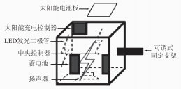 太陽(yáng)能自感光亮警告牌結(jié)構(gòu)主要包括太陽(yáng)能電池板、太陽(yáng)能充電控制器、LED發(fā)光二極管、中央控制器、紅外感應(yīng)裝置、蓄電池、揚(yáng)聲器、可調(diào)節(jié)固定支架等。太陽(yáng)能自感光亮警告牌結(jié)構(gòu)設(shè)計(jì)如圖1所示。