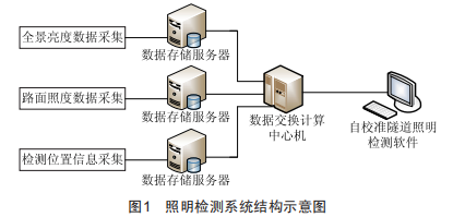 照明檢測系統結構如圖1所示。(1)實現車載全景亮度計對隧道路面亮度值的采集工作并進行數據庫存儲:(2)實現多點隧道路面照度信息的采集工作并進行數據庫存儲:(3)實現所采集數據與采集點位置信息一一對應:(4)根據同一位置全景亮度信息和照度信息進行建模,去除偏離點,得到亮度與照度信息轉換函數,可對數據進行二次校準,達到隧道照明數據快速檢測、相對穩(wěn)定可靠、標準均一的目的:(5)完成隧道照明智能檢測系統軟件,使其具備自校準功能,可生成全隧道照度信息分布表,多次測量可得出燈具衰耗曲線。