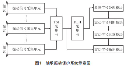 該軸承保護(hù)系統(tǒng)包括Ts1采集卡和DEH采集卡,Ts1采集卡和DEH采集卡信號(hào)連接,Ts1采集卡的輸入端連接有多個(gè)振動(dòng)信號(hào)采集單元,振動(dòng)信號(hào)采集單元固定在軸瓦外壁上,DEH采集卡的輸出端依次連接故障信號(hào)處理模塊、振動(dòng)信號(hào)判斷模塊、振動(dòng)信號(hào)運(yùn)算模塊和振動(dòng)信號(hào)輸出模塊,故障信號(hào)處理模塊接收DEH采集卡輸出的第一信號(hào)并輸出第二信號(hào),第二信號(hào)連接在振動(dòng)信號(hào)判斷模塊的輸入端,振動(dòng)信號(hào)判斷模塊輸出第三信號(hào),并輸入至所述振動(dòng)信號(hào)運(yùn)算模塊中,振動(dòng)信號(hào)運(yùn)算模塊輸出第四信號(hào),并輸入至所述振動(dòng)信號(hào)輸出模塊中,振動(dòng)信號(hào)輸出模塊輸出第五信號(hào),通過信號(hào)線纜發(fā)送至ETs系統(tǒng)中。軸承振動(dòng)保護(hù)系統(tǒng)示意圖如圖1所示。