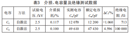 采用自激法測(cè)量顯示C1、C2介損均符合規(guī)范0.25%的要求,而電容量測(cè)試C1的電容變化百分比符合規(guī)范±2%的要求,C2的電容變化百分比為4.596%則超出了標(biāo)準(zhǔn)。