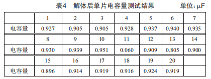 對(duì)該故障CVT進(jìn)行解體分析,首先放掉CVT油箱中的油,吊出電容單元后,設(shè)備外觀絕緣層正常,進(jìn)一步逐個(gè)對(duì)C2單片電容量進(jìn)行測(cè)試,得到結(jié)果如表4所示。