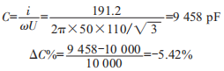 現(xiàn)場(chǎng)測(cè)試末屏電流N端為:i=191.2A。通過公式現(xiàn)場(chǎng)計(jì)算可以得出電容量為: