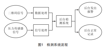 檢測系統(tǒng)流程如圖1所示,二維碼信號(hào)經(jīng)過相應(yīng)的數(shù)據(jù)處理,將其傳送到后臺(tái)檢測系統(tǒng):同樣,壓力傳感器經(jīng)過信號(hào)處理系統(tǒng)將信號(hào)傳送至后臺(tái)檢測系統(tǒng)。當(dāng)系統(tǒng)在特定時(shí)間內(nèi)檢測到壓力傳感器信號(hào)時(shí),即刻在后臺(tái)進(jìn)行記錄和存儲(chǔ),否則系統(tǒng)將自動(dòng)發(fā)出警報(bào),以此告知相應(yīng)的操作人員。