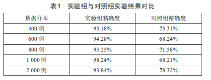 為了保證對比實(shí)驗(yàn)的客觀性,在保證兩種識別方法除涉及的內(nèi)部條件因素不同外,其他影響因素均相同的情況下完成實(shí)驗(yàn),記錄實(shí)驗(yàn)過程中產(chǎn)生的相關(guān)數(shù)據(jù)信息,通過相應(yīng)計(jì)算得出實(shí)驗(yàn)組與對照組識別結(jié)果的精確度,如表1所示。